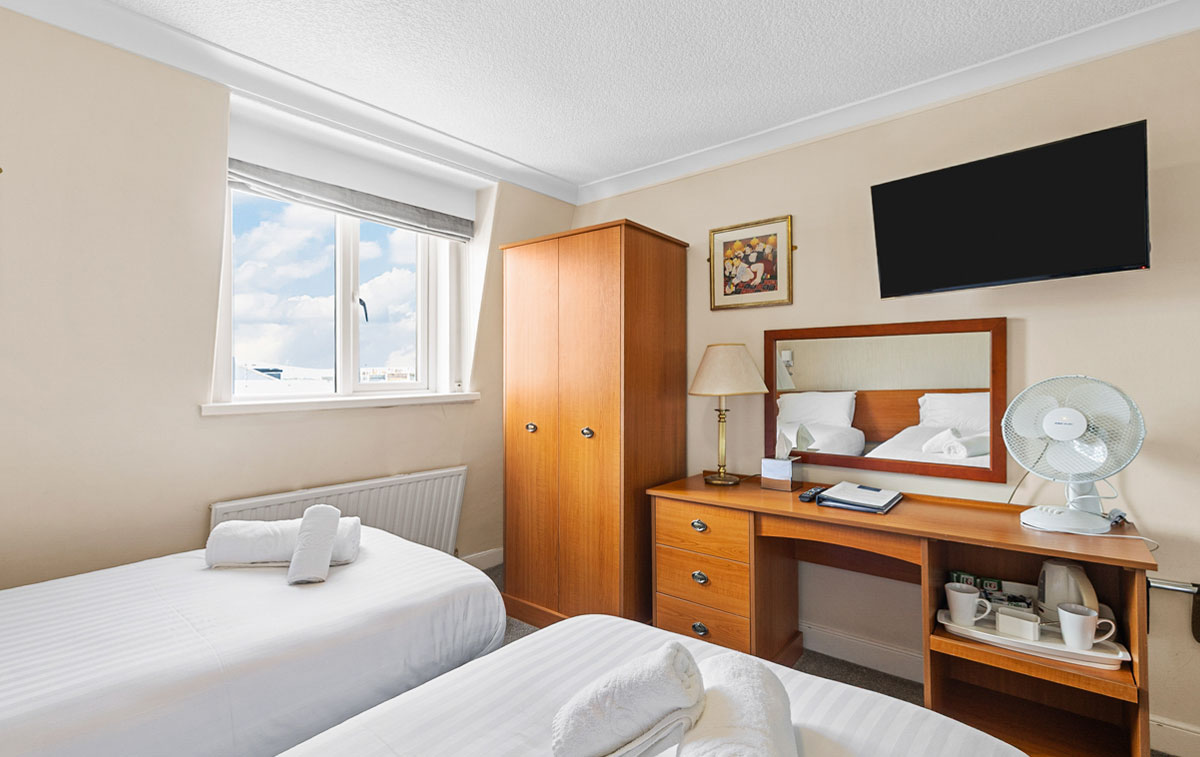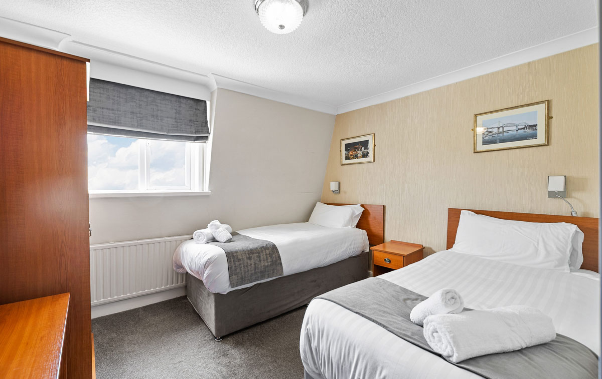 Our Twin rooms offer versatile accommodation with two single beds, perfect for friends travelling together or colleagues sharing space. Thoughtfully designed with comfort in mind, these rooms combine practicality with style, featuring quality furnishings, Smart TV technology and modern amenities.